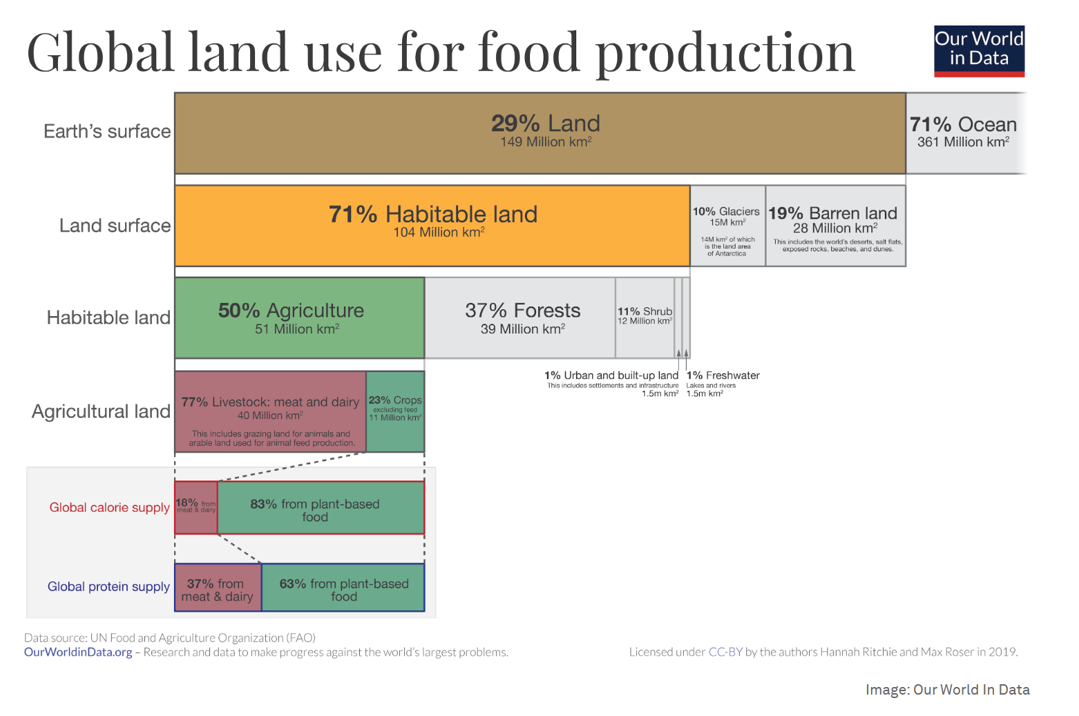 Дальше данные варьируются, но 2019 году Food and Agriculture Organization (FAO) заявили, что половина обитаемой площади земли занята агрокультурой; из этих агрокультурных площадей 77% занимает животноводство — производство мяса и молока. И при этом мясо и молоко составляют лишь 18% калорий, потребляемых людьми.